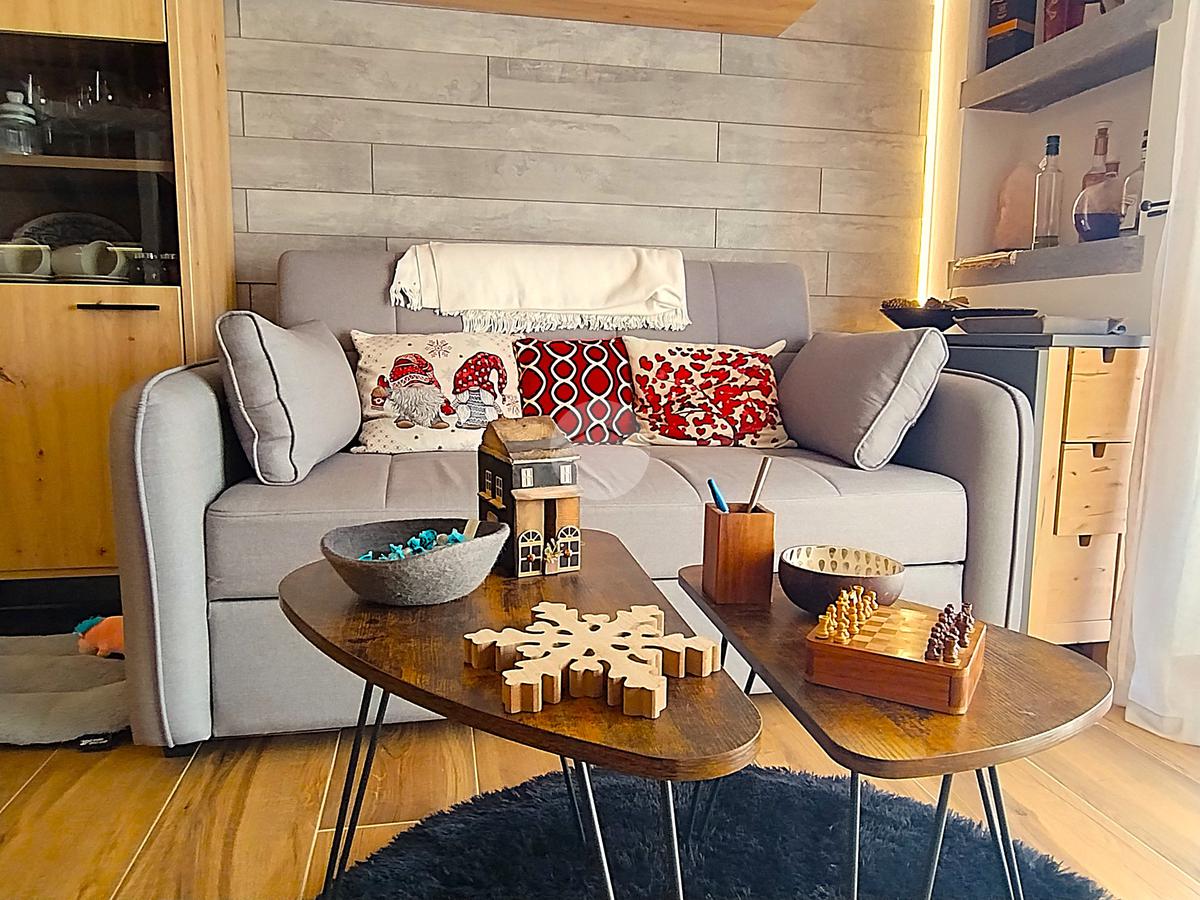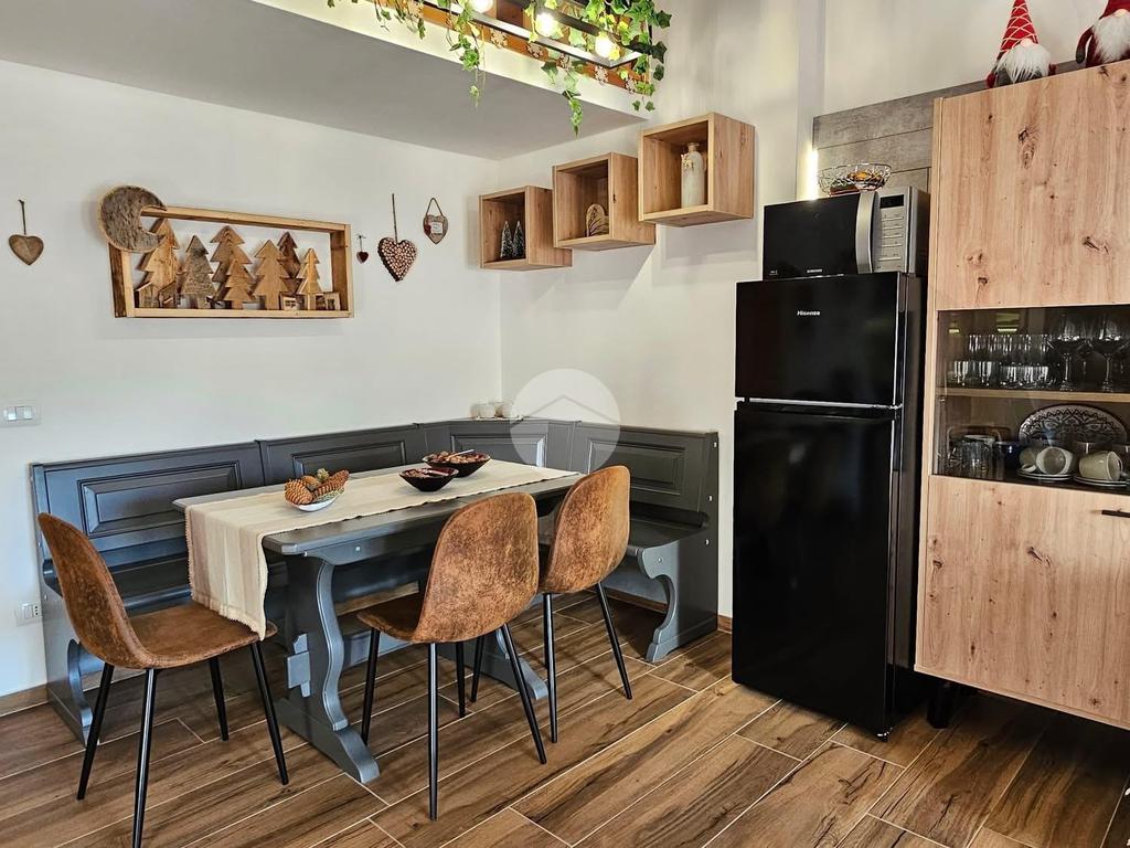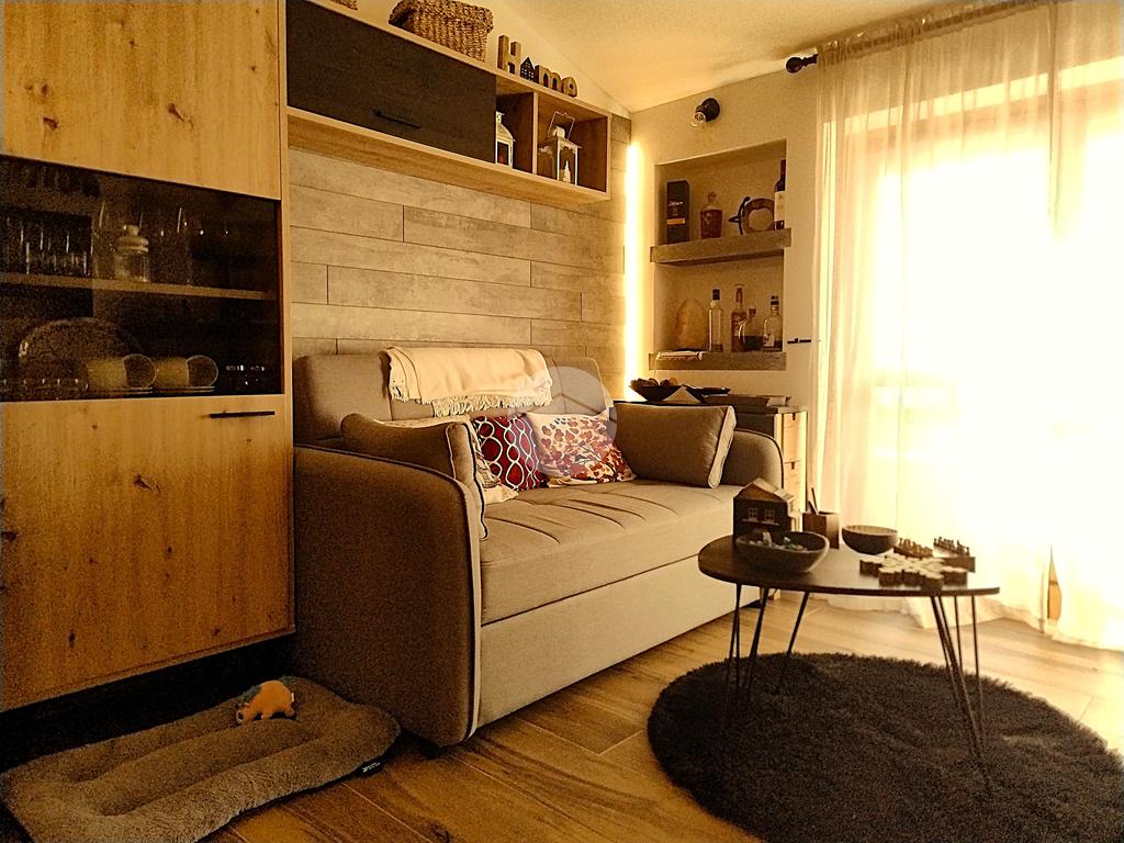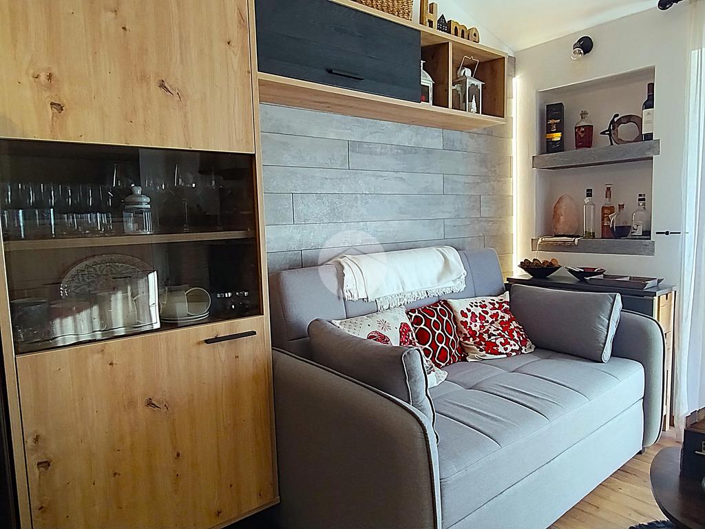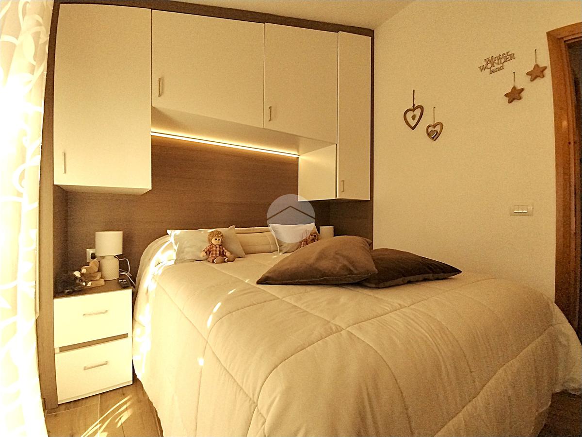 L’appartamento è composto da un soggiorno con divano letto e camino, cucina a vista, tavolo da pranzo e balcone, una camera matrimoniale con letto contenitore ed un balcone, un bagno con doccia. Un soppalco ospita un altro letto da una piazza e mezzo. L’appartamento è riscaldato e/o raffrescato da impianto canalizzato con pompa di calore. Ottima l'esposizione.